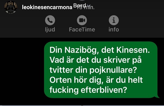 – Alexander Bard din fucking bögpedofil, bög, horunge. Att du ens säger sådana saker om svarta och säger du sådana saker om svarta det betyder det att du tycker likadant om oss blattar din fucking horunge. Att TV4 ens har dig som host gör de till horungar också förstår du din bögjävel. Jag hoppas inte jag ser dig. Du kommer höra från mig framöver din jävla fikus.
