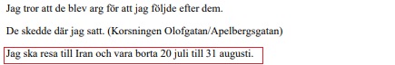 Det framgår också att mannen invandrade till Sverige från Iran som så kallat ensamkommande flyktingbarn med uppgiven ålder på 14 år och att han nu ska resa på semester till landet han flytt ifrån.