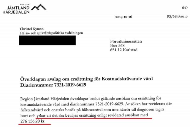 Samhällsnytt har tagit del av ärendena – som är fyra till antalet, inte fem – och kan nedan visa en överklagan av vilken det framgår att regionen söker ersättning med 276 156 kronor för en migrants vård.
