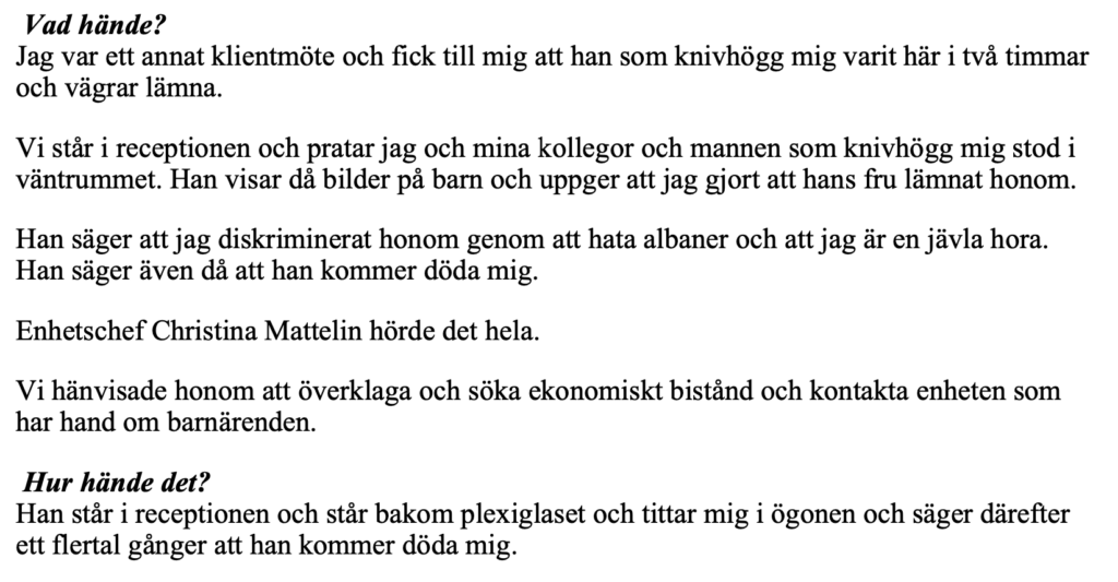 Bakgrunden till besöket var att han nekats ekonomiskt bidrag vid ett möte den 21 oktober och då lovade migranten att döda handläggaren som hade ansvar för beslutet. Enligt Dibran Tahiri hatar handläggaren albaner och är även ”en jävla hora”.
