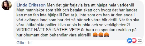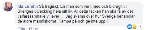 Många rasar i sociala medier Efter att Stigs dotter uppmärksammade fallet på Facebook har över 11 000 personer delat hennes inlägg. I flera kommentarer liknar man bilderna från koncentrationsläger under andra världskriget. Många förfäras över att det kan gå till så här i Sverige. En person frågar, ”var är alla våra skattepengar”.