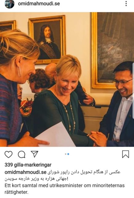 Etablissemanget har omfamnat Mahmoudi och välkomnat honom till maktens korridorer. Här nedanför syns den då 23-åriga aktivisten samtala med utrikesminister Margot Wallström (S) om minoriteternas rättigheter i oktober förra året.