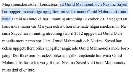 Migrationsverket nekade dock uppehållstillstånd med anledning av att uppgifterna var motstridiga och familjeförhållandena oklara. Mahmoudi överklagade beslutet men migrationsdomstolen slog fast att Mahmoudi och de fyra afghanerna inte hade gjort sannolikt att de levt i samma hushåll. En omständighet som domstolen särskilt uppmärksammat var att Mahmoudi och en av afghanerna hade olika uppgifter om vad Mahmoudis mor heter.