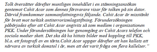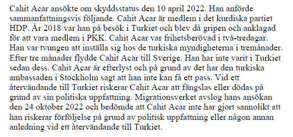 10 april förra året, ett halvår efter mordet och en dryg månad innan han häktas, skickar Acar in en asylansökan till Migrationsverket i Sverige. Han uppger att han är efterlyst i hemlandet, anklagad för att vara medlem i den terrorstämplade gruppen PKK. I sin asylansökan berättar han att han är medlem i det kurdiska partiet HDP som av den turkiska regeringen anses stå nära PKK.