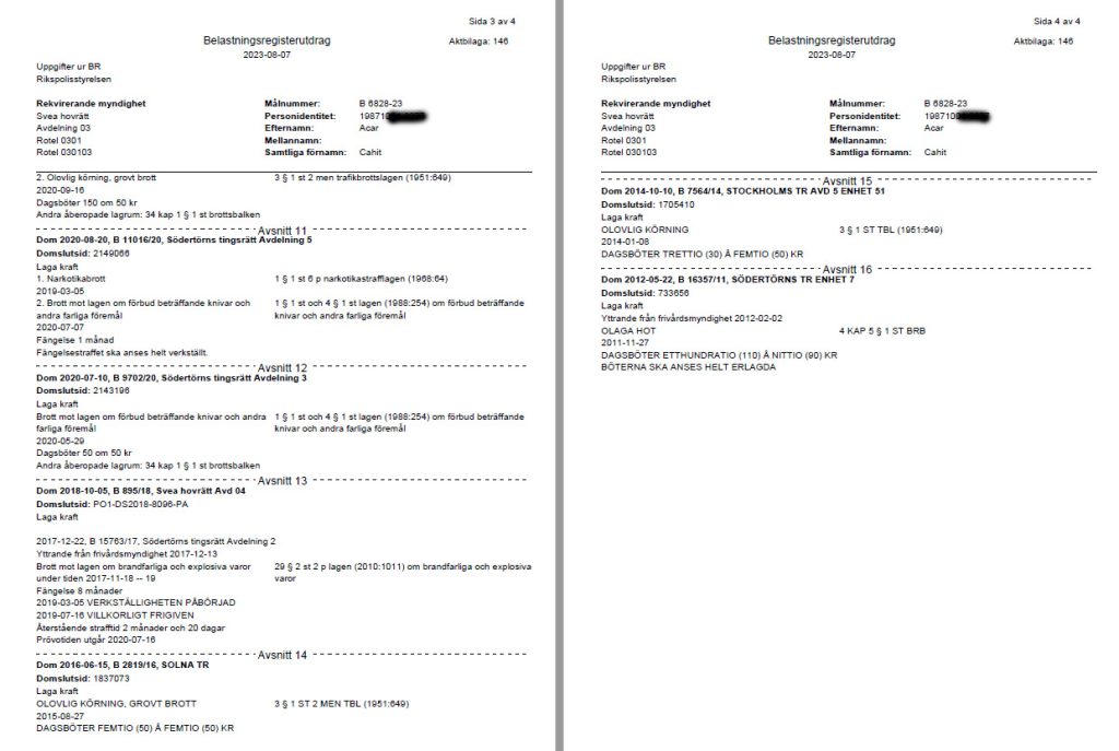 Cahit Acar har sedan 2012 dömts ett 20-tal gånger och har hela 16 avsnitt i belastningsregistet. Bland annat olaga hot, misshandel, brott mot knivlagen och en hel del ärenden som gäller olovlig körning.