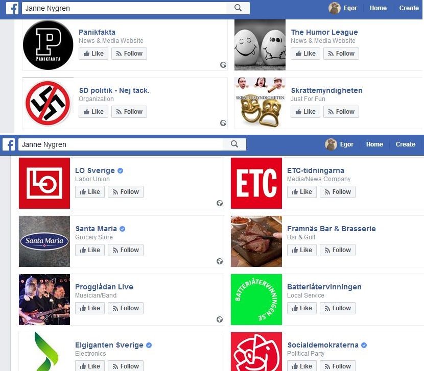 Det finns flera exempel på hur de här två profilerna ständigt korsar varandra. En genomgång av Jan-Olov Nygrens profil på Facebook visar att hans personliga åsikter är ungefär samma som han gav uttryck för när han utgav sig för att vara centerpartist som Telejampa: han hatar Sverigedemokraterna och är med i flera grupper som uttryckligen vill stoppa SD. Han gillar Socialdemokraterna och LO, men är även medlem i trollfabriken på Facebook Panikfakta som Samhällsnytt uppmärksammat tidigare: