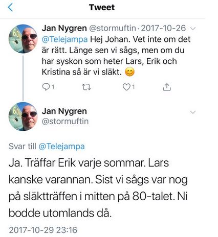 I detta ingår även Jan Nygrens eget riktiga konto på Twitter Stormuftin som märkligt nog togs bort när uppmärksamheten riktades mot Telejampa. Tidigare interagerade Jan-Olov Nygren med sig själv med hjälp av sina olika konton för att skapa trovärdighet: