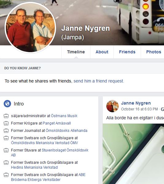 Jan-Olov Nygren, 55, kan knytas till kontot på flera olika sätt. Själva namnet på kontot är en kombination av Nygrens smeknamn – Jampa – och det folkliga namnet på elgitarrvarumärke Fender Telecaster – Tele. Jan Nygren är nämligen fritidsmusiker som spelar just på en elgitarr: