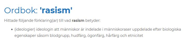 Enligt sidan ordlista.se är rasism dock ett mycket snävare begrepp: