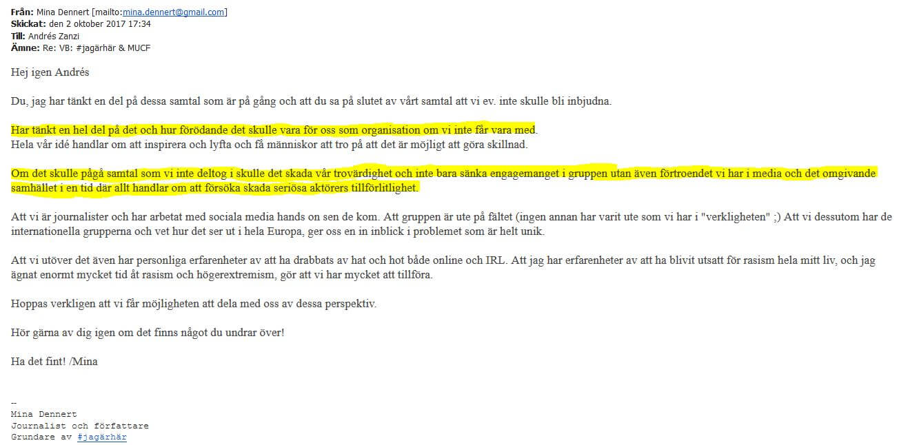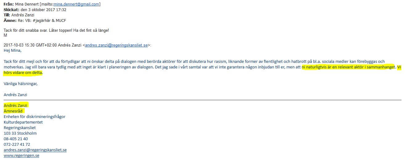 Så det är i detta sammanhang Mina Dennert vill vara närvarande med sitt nätverk #jagärhär. Av svaret till Dennert från ämnesrådet Andrés Zanzi följer att hennes deltagande inte alls är uteslutet, Nätverket erkänns vara ”naturligtvis en relevant aktör i sammanhanget”. ”Vi hörs vidare om detta”, lovar Zanzi: