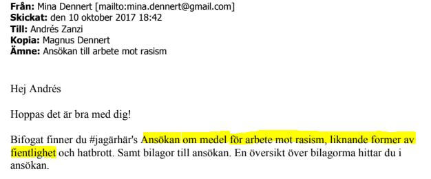 Bara åtta dagar senare inkommer en bidragsansökan till Kulturdepartementet om en halv miljon kronor för just arbete mot rasism, liknande former av fientlighet och hatbrott – alltså med samma rubrik som den nationella planen: