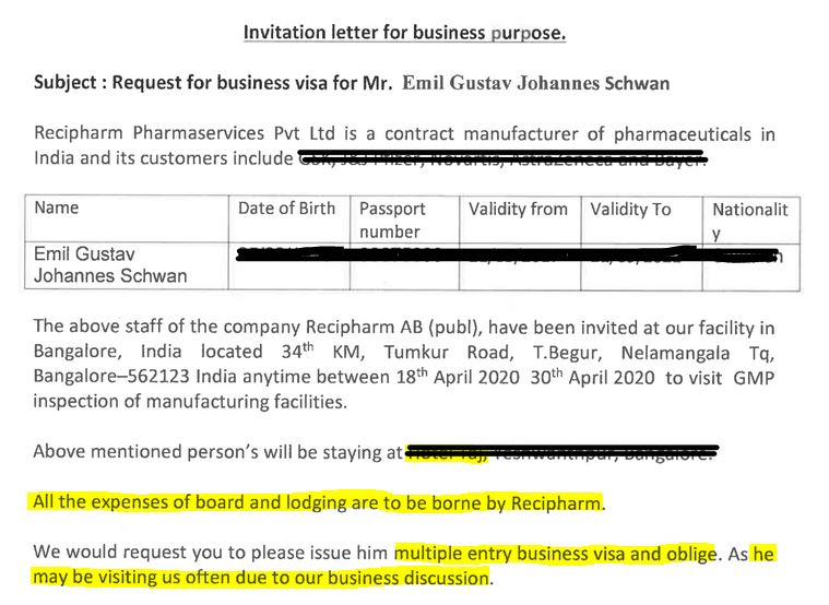 I inbjudan för visum uttrycker Recipharm en önskan om att inspektörerna ska få ett flerårigt multivisum eftersom de kommer att besöka företaget ”ofta” på grund av ”business discussion”: