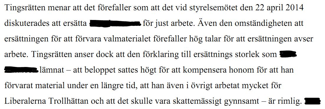 Tingsrätten ifrågasatte den höga ersättningen – 10 tusen kronor för förvaring av valmaterial i fyra månader. Under huvudförhandlingen kom det fram att ersättningen i själva verket handlade om en dold betalning för arbete. Att ta ställning just till denna omständighet låg utanför grunderna för yrkandet, därför tog tingsrätten inte ställning i frågan. Dock finns följande att läsa i domen motiveringsdel: