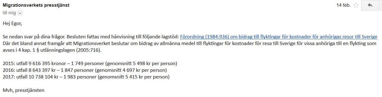 Myndigheten har sammanställt en statistik för Samhällsnytt efter förhandlingar via email som tog över en månad. Enligt den kunde 1 983 personer resa in i Sverige med hjälp av bidraget ifjol. Den totala kostnaden för statsbudgeten har blivit 10 738 104 kr. Antalet anhöriginvandrare som använder sig av resebidraget växer med varje år: år 2015 låg siffran på 1749 personer medan 2016 ökade antalet till 1847: