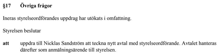 ”Styrelsen beslutar att uppdra till Nicklas Sandström att teckna nytt avtal med styrelseordförande. Avtalet hanteras därefter som anmälningsärende till styrelsen.”