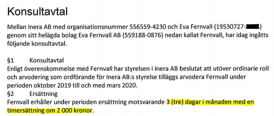Det går inte att förstå vad ärendet handlar om förrän vi begär bilagorna. Bilagan 12g är ett avtal om konsulttjänster som ger Fernvall sammanlagt 48 tusen kronor per månad för tre dagars arbete. Avtalet gäller retroaktivt fr o m oktober 2019 och t o m mars 2020. Det framgår även tydligt av rubriken på dokumentet – ”Utökat uppdrag till Ineras styrelseordförande” – att tilläggsarvodet gäller just Fernvalls uppdrag och borde därmed falla under aktiebolagslagen: