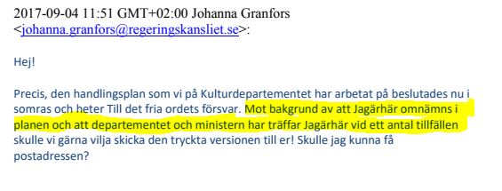 ”Mot bakgrund av att Jagärhär omnämns i planen och att departementet och ministern har träffar Jagärhär vid ett antal tillfällen skulle vi gärna vilja skicka den tryckta versionen till er!”