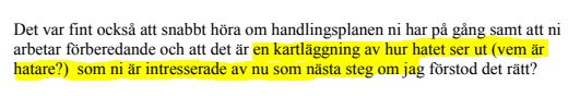 Av mejlkonversationer innan mötet framgår dock att det som skulle diskuteras var bland annat en kartläggning ”av hur hatet ser ut (vem är hatare?)”. Mina Dennert skriver i sitt mejl att det var ”fint att höra” att departementet skulle vara intresserad av en sådan kartläggning ”som nästa steg”: