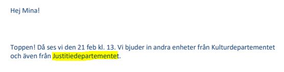 Ämnet som ska ha diskuterats är, enligt Modée, #jagärhär:s arbete mot hot och hat på Facebook. Förutom personal på Kulturdepartementet bjöds även in tjänstemän från Justitiedepartementet – närmare bestämt från Straffrättsenheten och Kriminalpolitiska enheten: