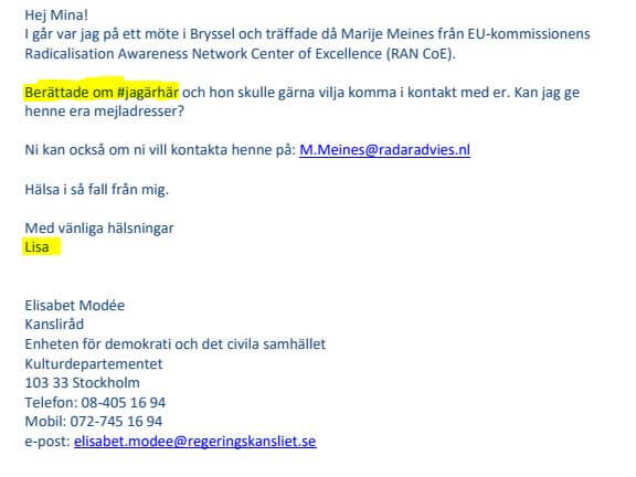 Den 21 februari 2017 framför hon dock i ett mejl adresserat till paret Dennert kontaktuppgifter till en projektledare på FOI (Totalförsvarets forskningsinstitut) som arbetar just med att kartlägga ”extremistiska budskap via internet och sociala medier”. I mejlet tillägger Modée följande: