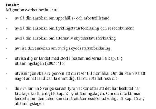 Mannen påstod att Al-Shabaab vill straffa honom därför att han deserterade från terrororganisationen. Migrationsverket bedömde dock att det inte finns någon allvarlig risk för repressalier från Al-Shabaab mot mannen eftersom en stor del av Somalia, inklusive huvudstaden Mogadishu, är befriad från grupperingen – därför finns en möjlighet för intern flykt.
