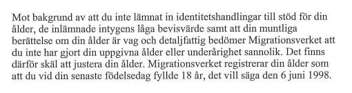 ”Migrationsverket bedömer att du inte har gjort din uppgivna ålder eller underårighet sannolik”, skriver myndigheten i sitt beslut: