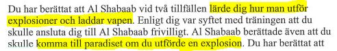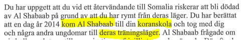 Idag kan Samhällsnytt avslöja att mannen rekryterades till den terrorstämplade islamistiska organisationen Al-Shabaab med tvång redan när han var 14 år gammal. Enligt Migrationsverkets beslut lämnade mannen så detaljerade och samstämmiga uppgifter om den tiden att myndigheten väljer att tro på dem. Stenslungaren tränades bland annat att hantera vapen och utföra explosioner. Enligt egen utsago ville Al-Shabaab förmå honom att bli en självmordsbombare. Mannen kommer från en liten stad i regionen Shabelle Dhexe i södra Somalia och tillhör klanen Abgaal.