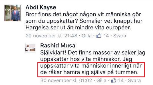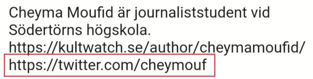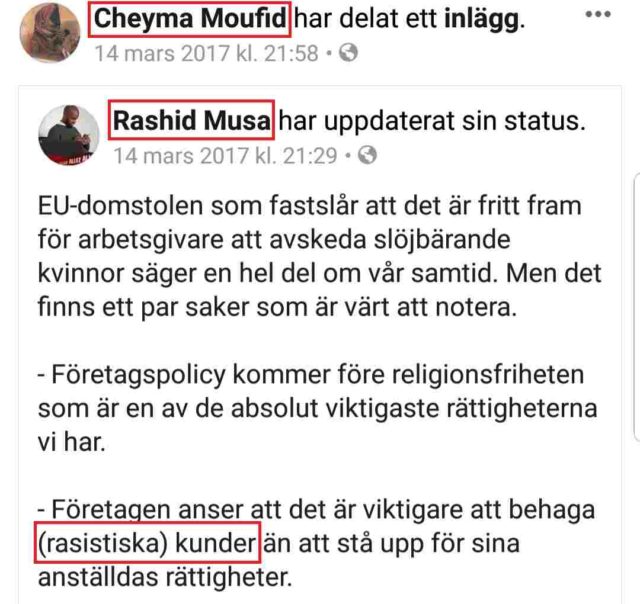 Delar islamisten Rashid Musa Det är dock inte bara fadern som utgör kopplingen mellan SVTs reporter Cheyma Moufid och radikal islamism. Vår nätgranskning visar att Moufid stödjer terrorkopplade organisationer och islamister. På Facebook delar SVT-anställda Moufid ett inlägg författat av islamisten Rashid Musa, ordförande för Sveriges unga muslimer. Musa hävdar att de som kritiserar den muslimska slöjan i Sverige är ”rasister”.