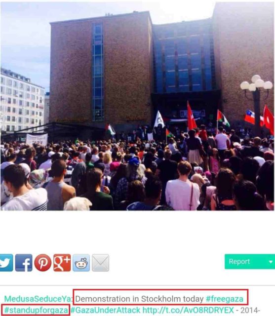 Vi påträffar ett antal bilder med palestinsk propaganda och en bild från en demonstration för Gaza i Stockholm. Här nedanför följer delar av det bildmaterial som hon har engagerat sig i.