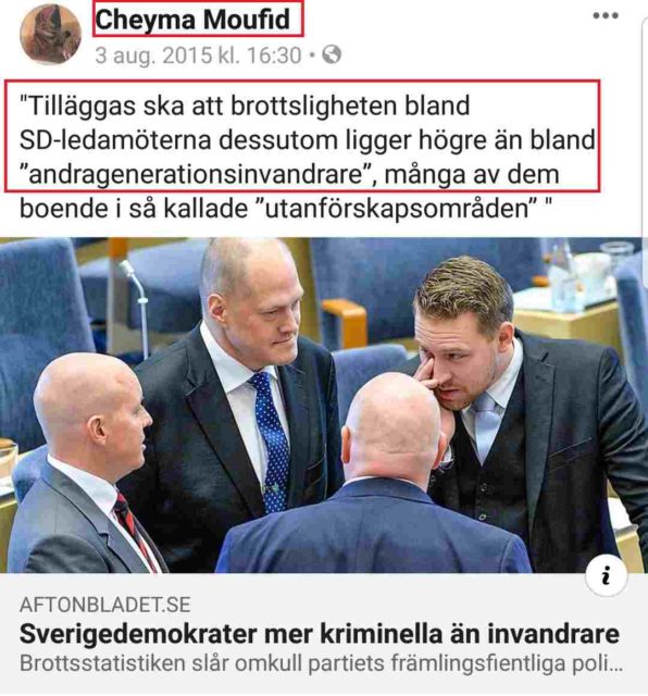 ”SD-ledamöter mer kriminella än invandrare” På Facebook delar SVT-reportern Moufid även en artikel som hävdar att ledamöter tillhörande Sverigedemokraterna är mer kriminella än andra generationens invandrare. Det är oklart hur tydliga politiska ställningstaganden av det slaget rimmar med rollen som reporter i förment opartisk public service.