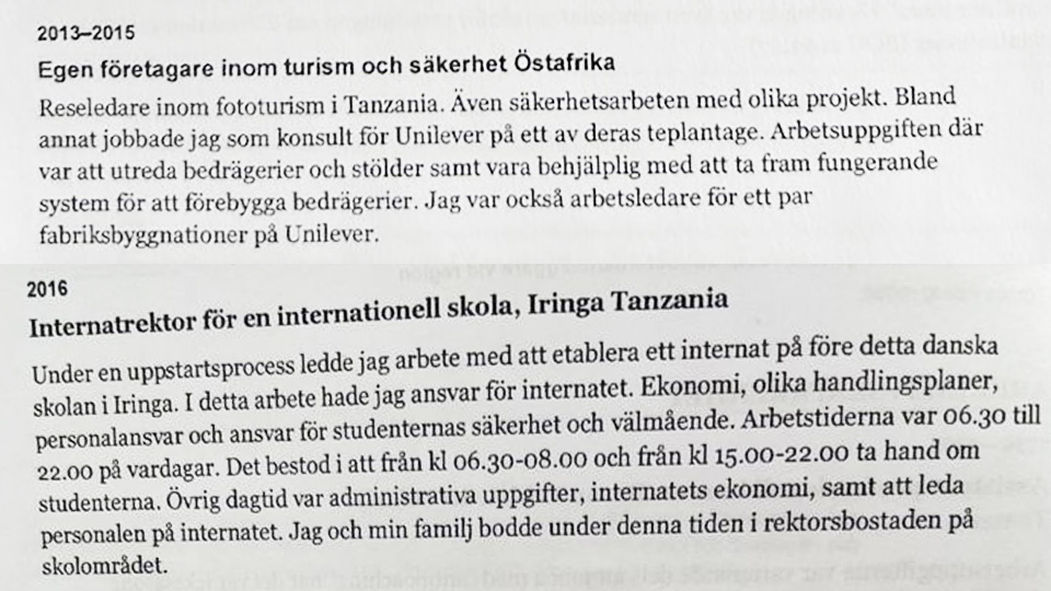 I maj förra året söker nämligen Åberg jobb på en nyskapad utredningsavdelning på Arbetsförmedlingen. I samband med det skickar han med ett CV, där han inte minst redogör för var han hållit hus från 2013 och framåt.