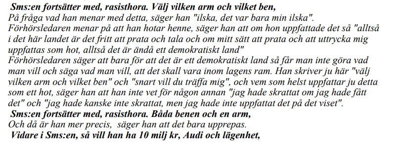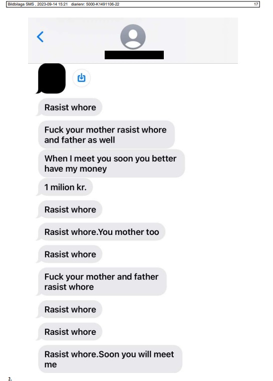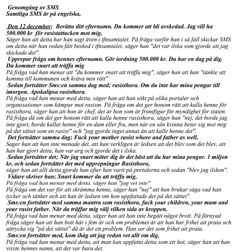 Efter telefonsamtalet fortsatte mannen att kontakta sin tidigare chefen över SMS-meddelanden. I meddelanden står det bland annat att läsa att kvinnan är en ”rasisthora” och att en miljon kronor ska fram.