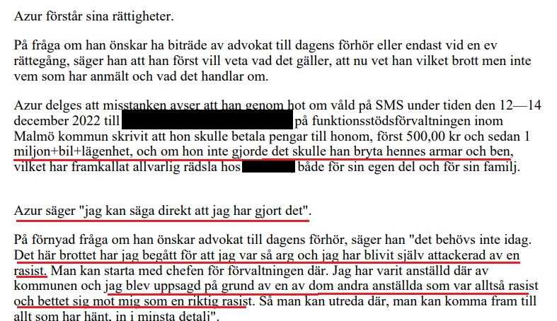 Den kvinnliga chefen satte samtalet på högtalare för att hennes kollega också skulle få ta del av vad migranten hävde ur sig. I samtalet ska Azur bland annat ha krävt en halv miljon kronor, en Audi-bil och en ny lägenhet.
