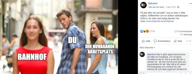 Det var i april förra året som Bahnhof publicerade en jobbannons i sociala medier som byggde på den mycket populära skämtbilden ’distracted boyfriend’. Annonsen bröt igenom bruset på internet och blev mycket uppmärksammad. Den resulterade även i flera anmälningar till Reklamombudsmannen (RO).