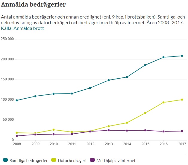 Den 22 november publicerade Brottsförebyggande rådet (Brå) statistik över bedrägeribrott i landet. Rapporten visar att anmälningarna under 2017 uppgick till 209 000 ärenden.