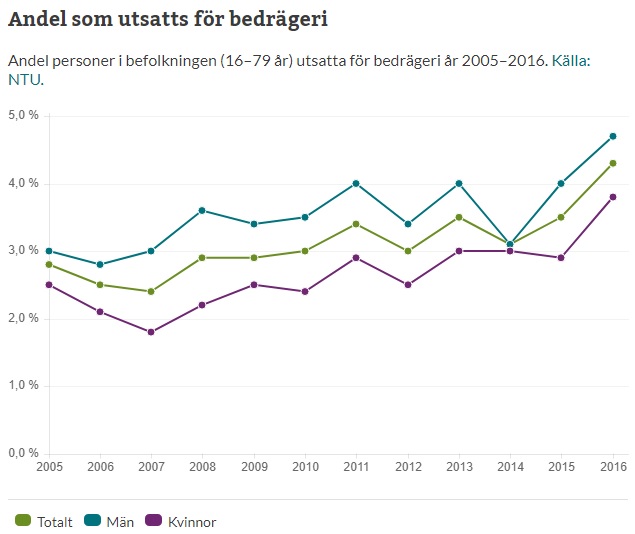 I rapporten från Brå visar den reguljära Nationella trygghetsundersökningen (NTU) att 4,3 procent av befolkningen mellan 16–79 år har blivit utsatta för bedrägeri under 2016, vilket motsvarar cirka 326 000 personer. Det är en större andel utsatta jämfört med 2015, då 3,5 procent uppgav att de hade blivit utsatta.