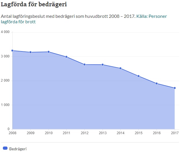 Antalet bedrägeribrott ökar till rekordnivåer i landet. Enbart under augusti inkom 21 205 anmälningar till polisen. Samtidigt visar statistik från Brottsförebyggande rådet (Brå) att polisen klarar upp allt färre bedrägerier. Under 2017 lagfördes endast 1 700 personer för bedrägeri som huvudbrott, en minskning med tio procent sedan föregående år. Siffror för 2018 är inte sammanställda än.