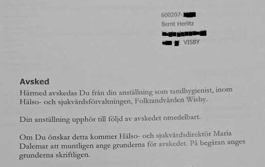Men riktigt så blev det inte. 14 dagar senare blev Bernt avskedad efter 10 års tjänst på Folktandvården. Arbetsgivaren menade att han bröt mot patientsekretess vilket skulle ha varit till men för hans patienter.