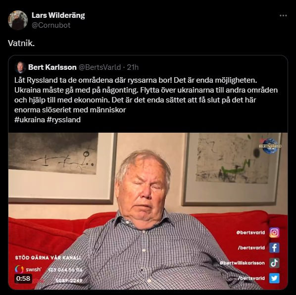 Låt Ryssland behålla de delar av östra Ukraina där det bor ryssar, och avsluta kriget. Det förslaget ger tidigare politikern, företagaren och mångmiljonären Bert Karlsson. Nu kallas han ”vatnik” av sina kritiker.– Det skiter jag i! säger han till Samnytt.