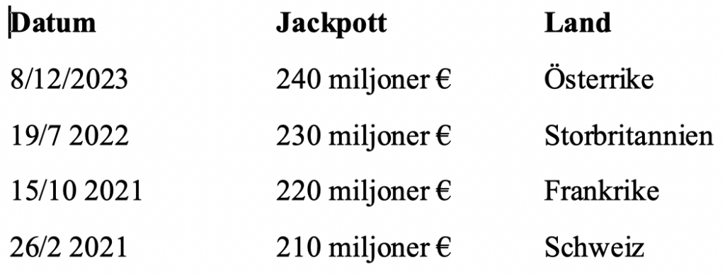 Jackpotten på 208 miljoner € (efter avdrag 166,4 miljoner €) i kommande dragning på tisdag den 26 november är EuroMillions femte största jackpott. Tabellen nedan visar när och i vilket land de fyra största EuroMillionsjackpottarna vanns.