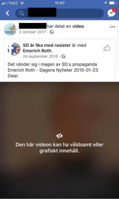 Detta trots att sidans namn är ”SD lika med rasister” och exempelvis bilden nedan som hon delat tydligt uppmanar till motstånd mot Sverigedemokraterna som inte ska betraktas som ett riksdagsparti som andra.