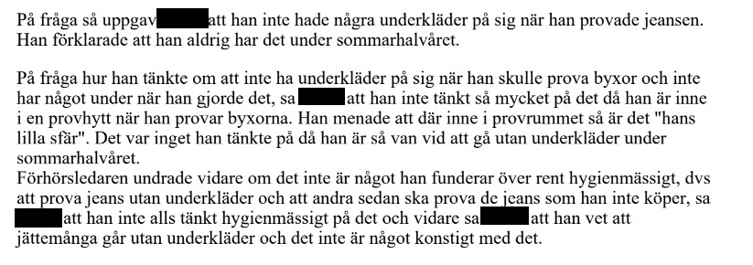 Enligt butikspersonalens vittnesmål har polismannen medvetet visat sitt kön i båda butikerna genom att bland annat öppna upp gardinerna till provhytten när han var naken. Enligt kvinnorna sökte polismannen även deras blick.