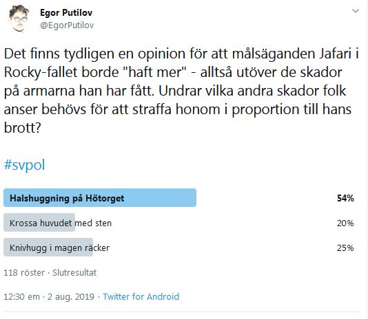 Dessvärre fick jag över hundra svar. En del av dem var säkert på skoj, men en del menade allvar utifrån deras kommentarer. Det som var ännu mer förvirrande var att vissa av dem som ville att Jafari skulle halshuggas på Hötorget hade ”västerländska värderingar” med i sin profilbeskrivning på Twitter. Det är visst så att offentliga halshuggningar stämmer mer överens med värderingar i en annan del av världen, men vi lämnar det därhän.