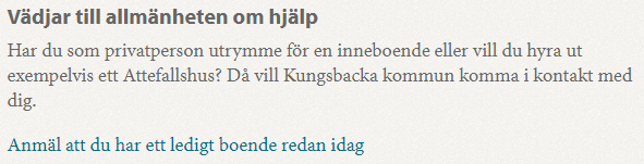 Kungsbacka i Hallands län befinner sig i akut bostadskris. Det saknas bostäder till närmare 400 nyanlända som anvisats till kommunen för 2018. I ett pressmeddelande vädjar kommunen till allmänheten om hjälp.