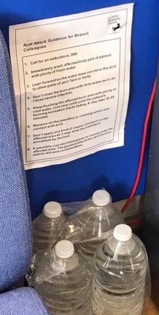 Den brittiska banken Lloyds Banking Group tar nu det säkra före det osäkra och erbjuder säkerhetsrutiner för personalen vid bankkontor runt om i landet för den händelse de skulle drabbas av syraattacker som blivit allt vanligare i landet.
