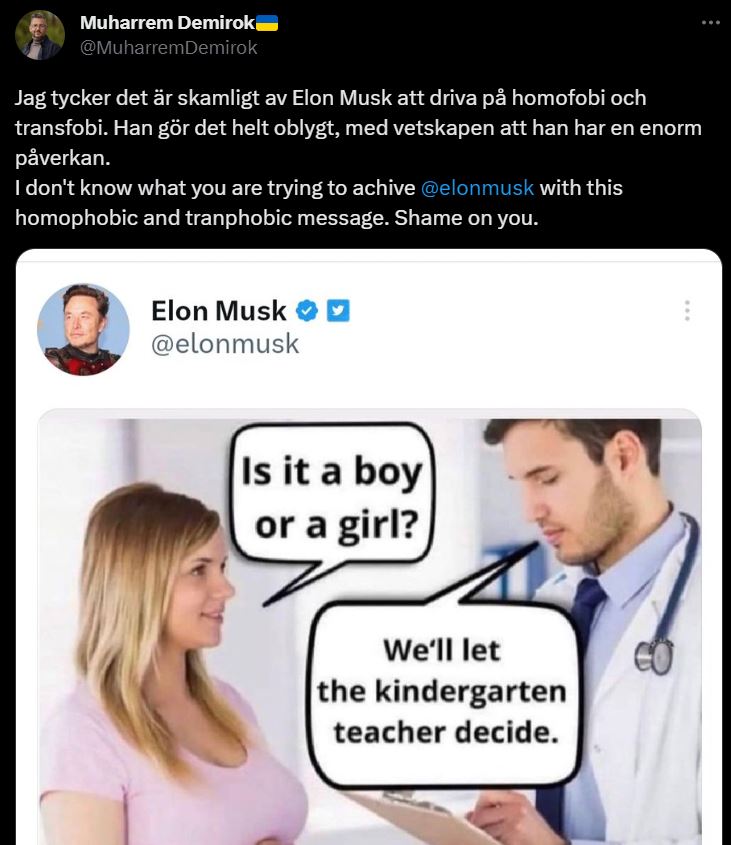 För några dagar sen delade Teslamiljardären Elon Musk, tillika Twitters ägare sedan en tid tillbaka, en skämtbild där man skojar med samtidens kamp mot grundläggande biologi. Detta blev för mycket för Muharrem Demirok (C).