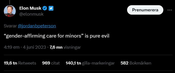 Musk har tidigare tagit ställning mot politiskt korrekthet och då barn och unga stympas för att bekräfta det kön de för tillfället tror sig tillhöra – något som i de allra flesta fall brukar gå över senare i livet men som just nu anses vara inne med sociala medier som påverkar och förvirrar ytterligare.