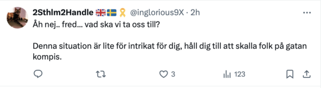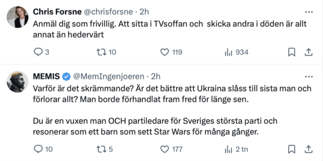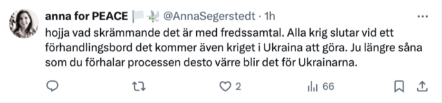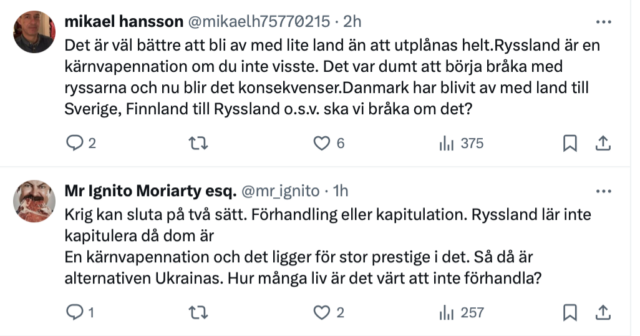 En annan person skriver följande om att världsledare öppnar för en fredslinje, ”Varför är det skrämmande? Är det bättre att Ukraina slåss till sista man och förlorar allt?”.