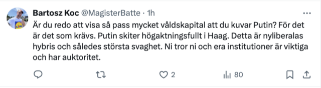 Det är i ett inlägg på X, tidigare Twitter, som C-ledaren reagerat med ordet ”skrämmande” över att världsledare har öppnat för att samtala med Rysslands president Vladimir Putin om kriget.