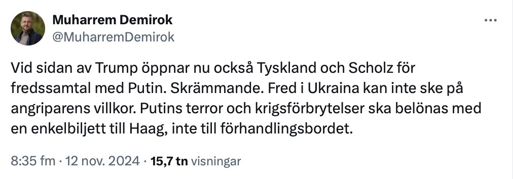 Att USA:s nyvalde president Donald Trump men även Tysklands förbundskansler Olaf Scholz nu öppnar för en fredslösning i Ukraina är något som har fått Centerpartiets ledare Muharrem Demirok att rasa. Centerledaren kräver att väst ska se till att Rysslands president Vladimir Putin grips och förs till krigsförbrytartribunalen i Haag.